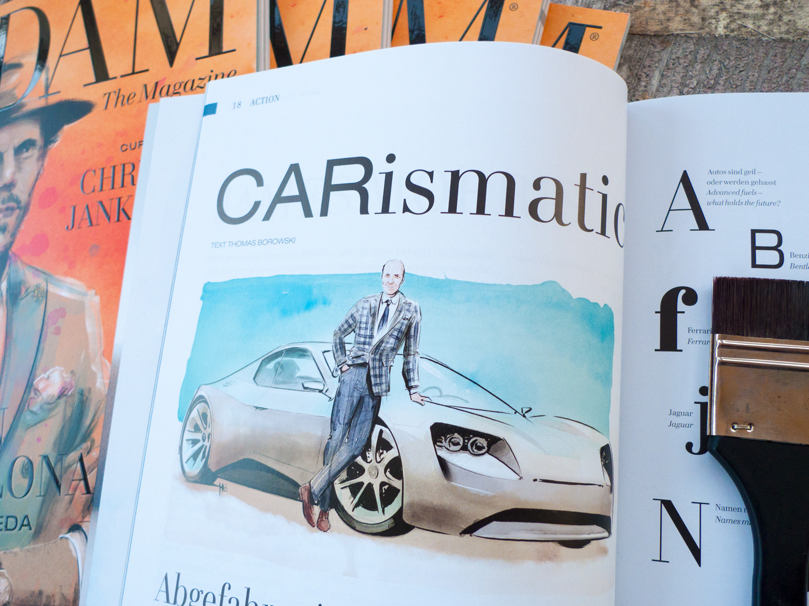 Editorial Illustration - CARismatic by editor Thomas Borowski. The illustration is a drawing of him with a concept car that I designed myself.