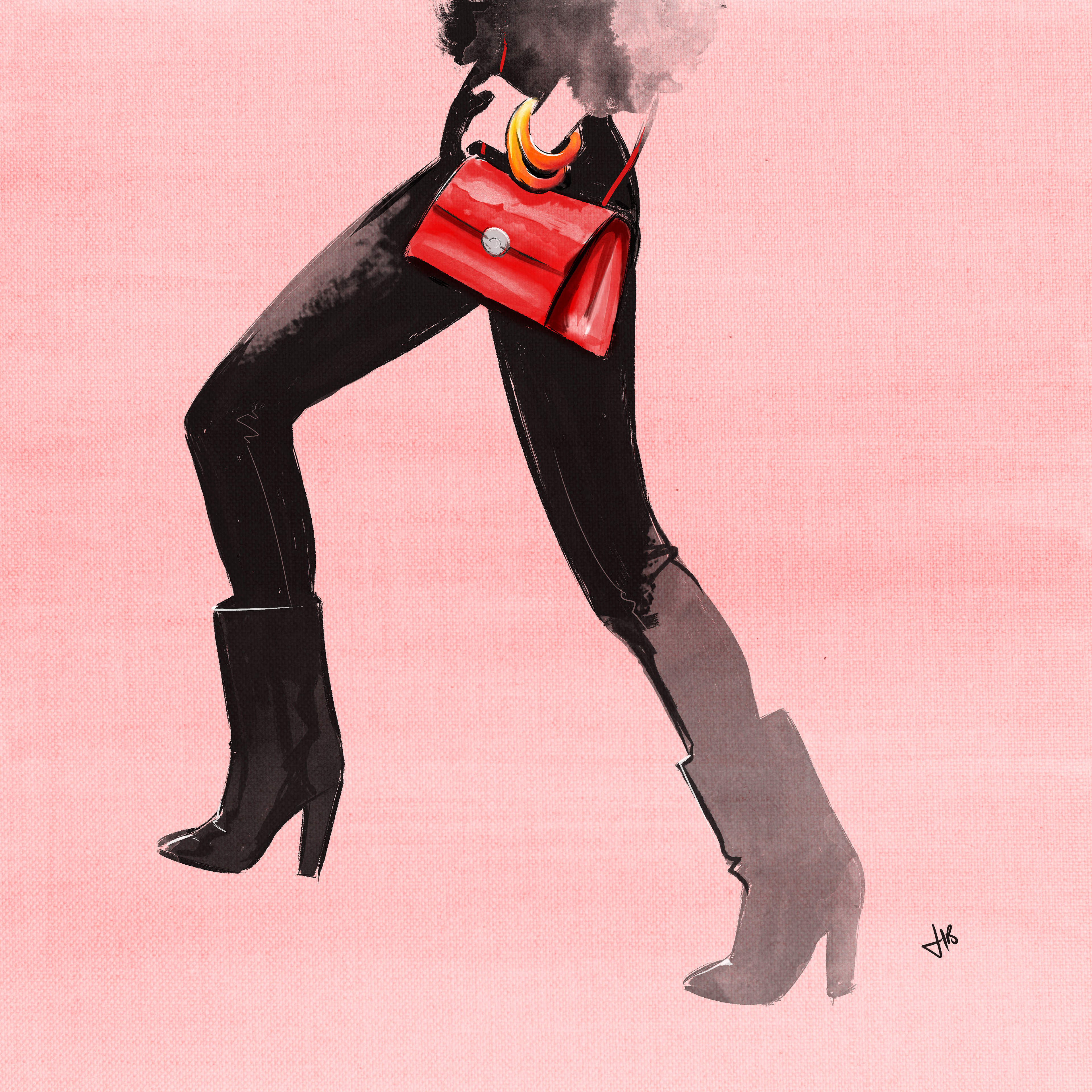 Painting of a woman wearing calf high boots and a red patent leather handbag
