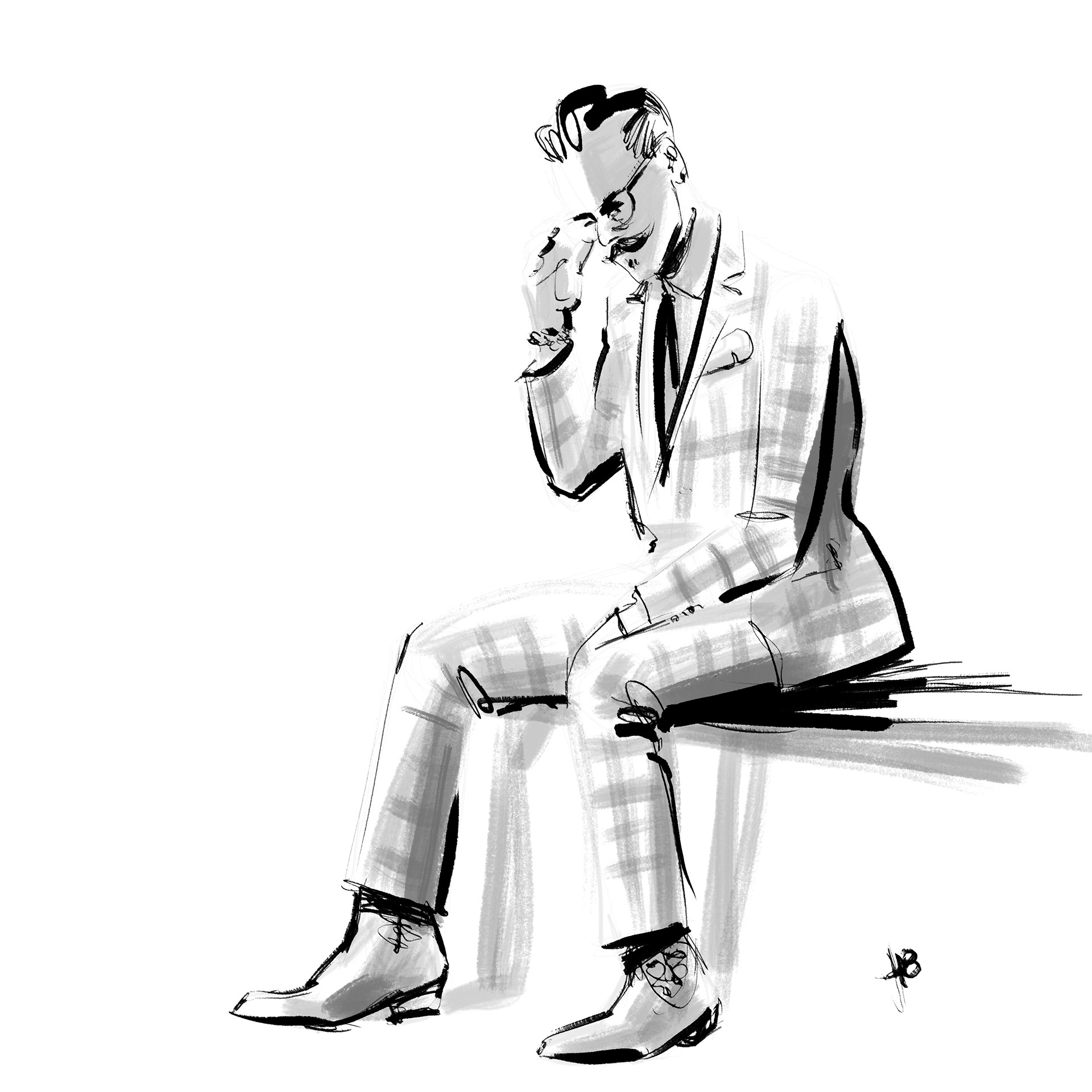 Menswear illustration, style sketch of a rock 'n roll type of dandy.