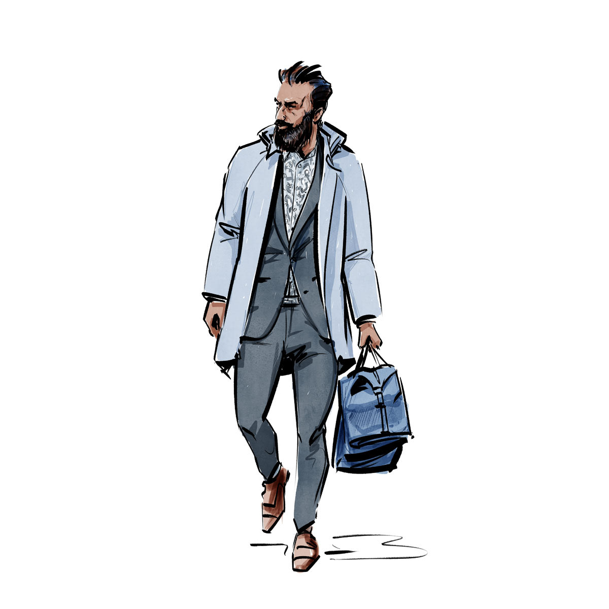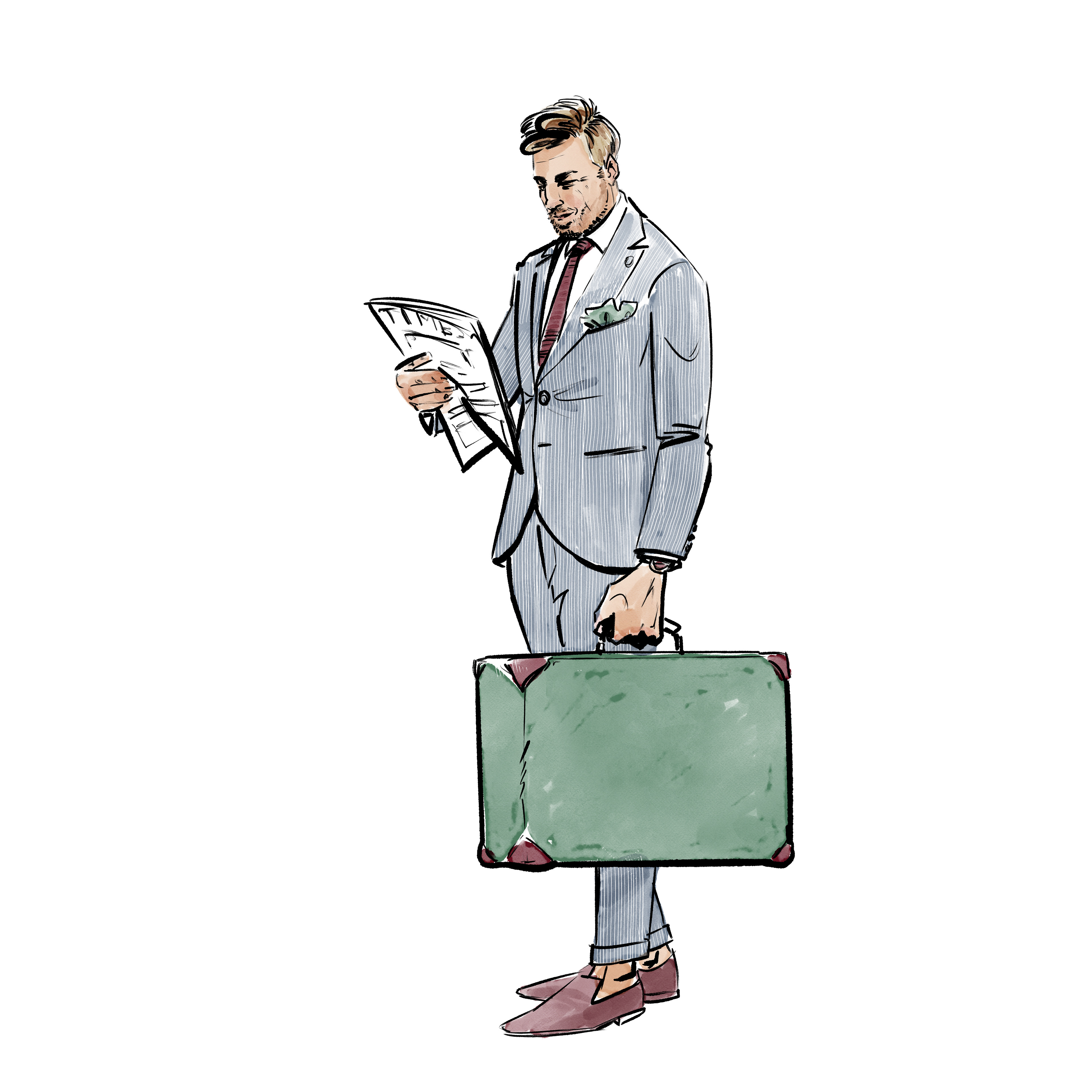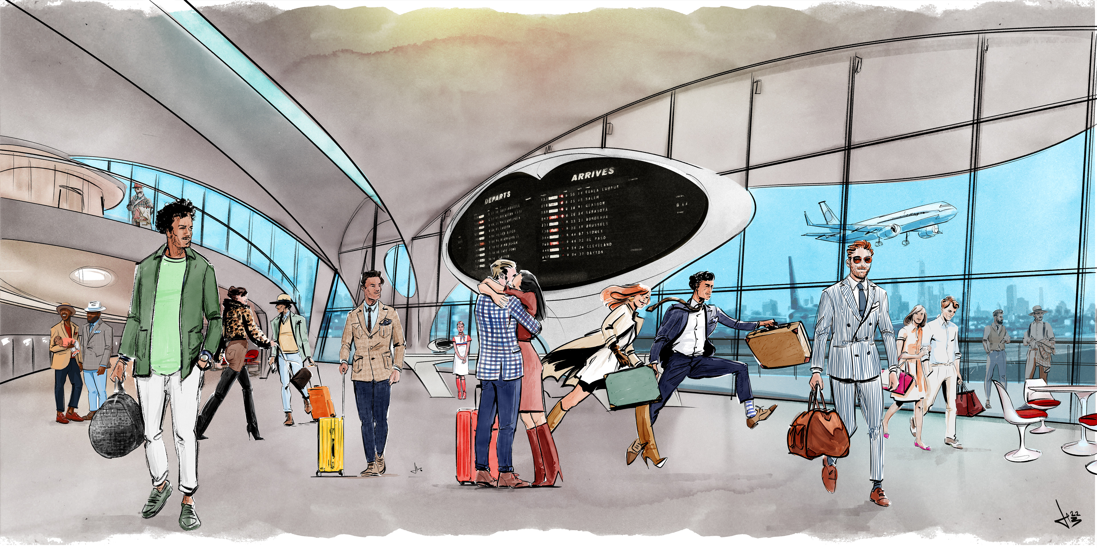 In 2022 Dutch Dandies looked back at the glory days of travel. I drew a mood image, featuring the TWA flight center, full of stylishly traveling gentlemen.