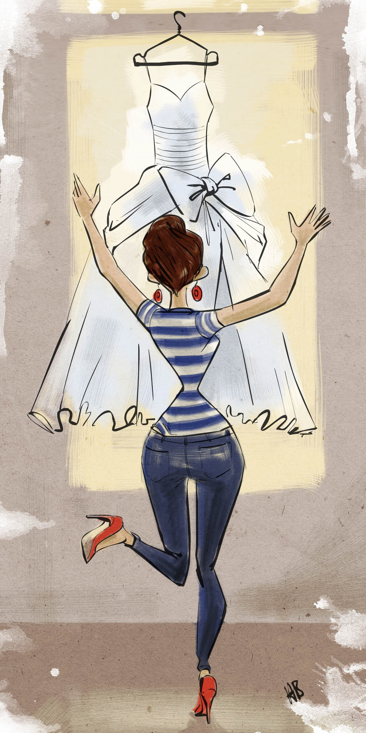 Finally time to put on the dress. The girl is excited to finally be able to wear her wedding dress on her big day!