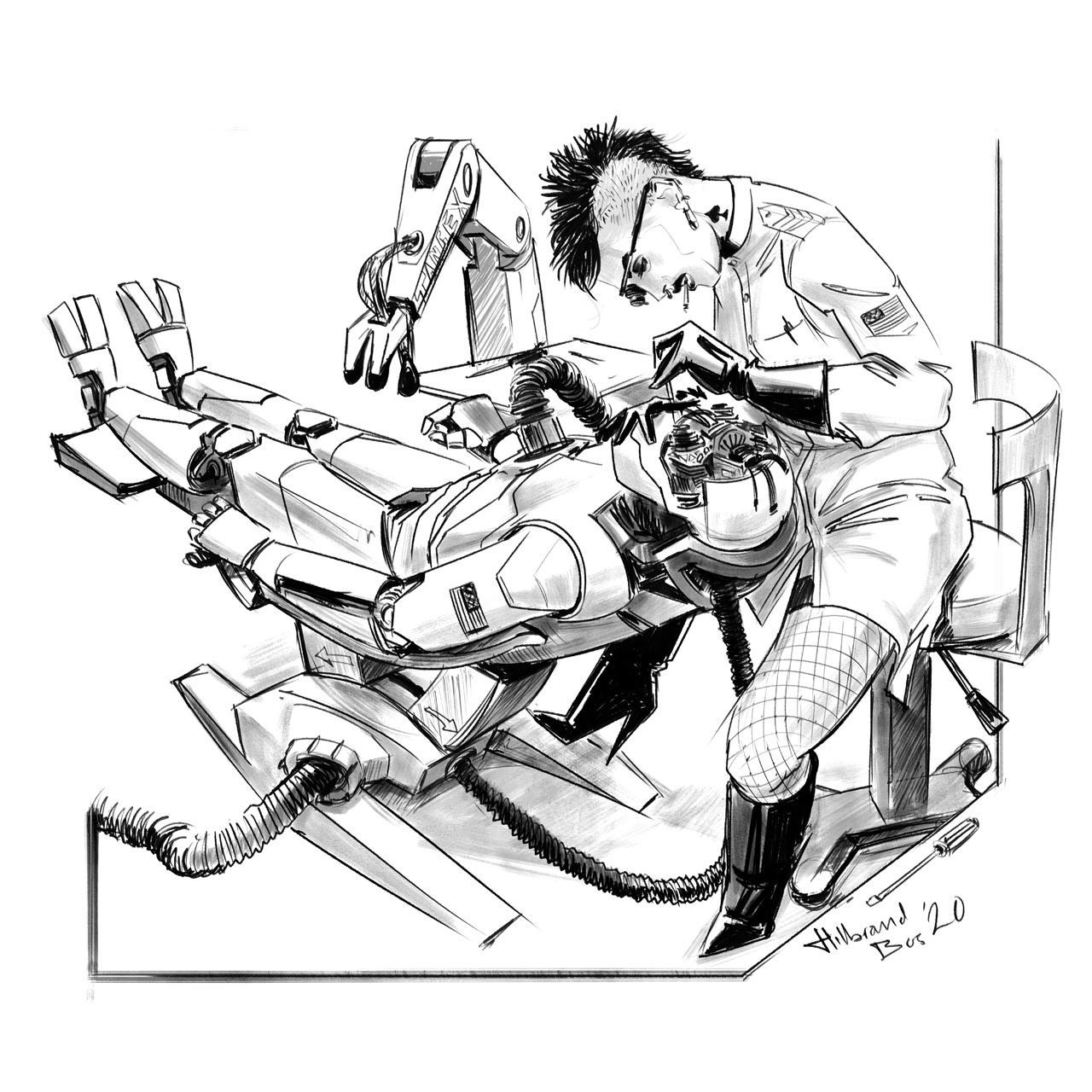 The prompt for this illustration was 'the subject of a secret government project'. Which got me thinking of punky and nerdy female scientists working on robot soldiers.