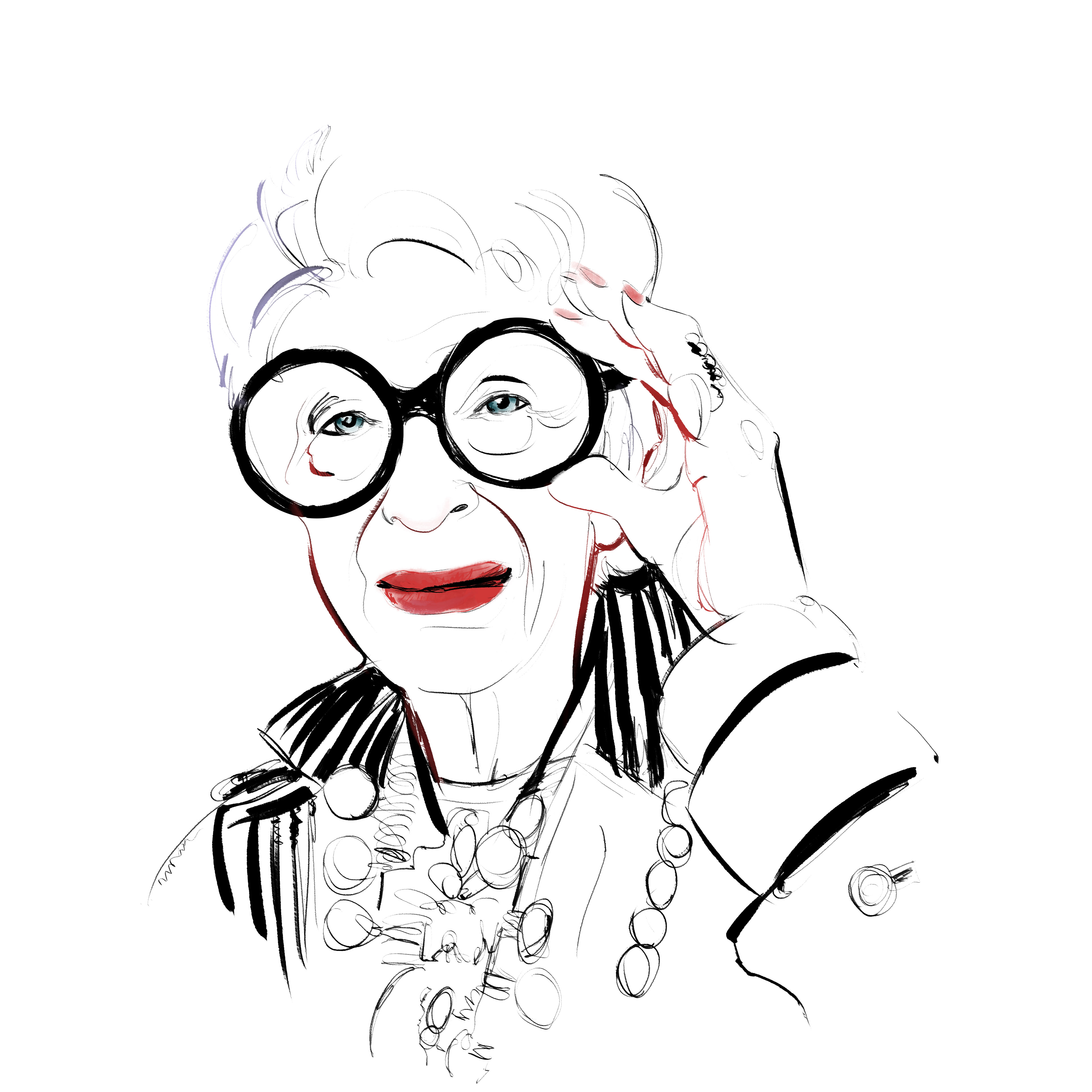 Ink style illustration of Iris Apfel, godmother of all things fashion and style.