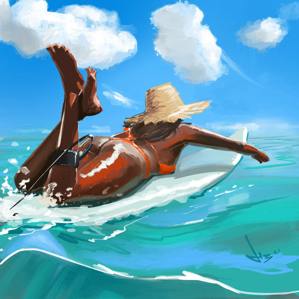 Painting of a surfer girl. Study in painting water and wetness.