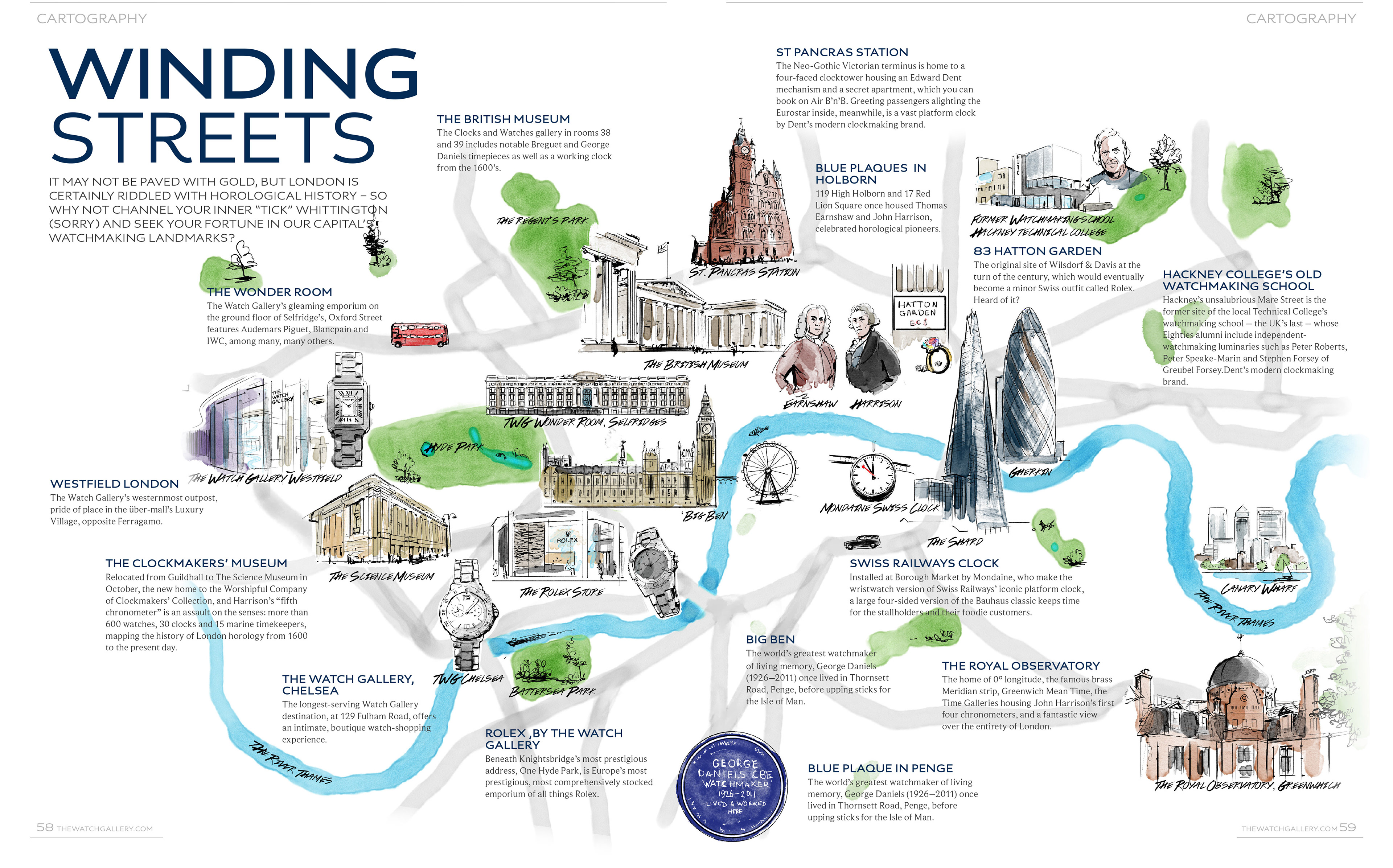I was asked to draw a stylized map (it's actually pretty geographicallly accurate) of London for featuring in the in house magazine of The Watch Gallery.